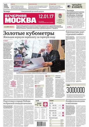 «Вечерняя Москва» — ежедневная российская вечерняя газета, старейшее из вечерних изданий в России, учрежденное в 1923 году. Выходит пять дней в неделю, кроме субботы и воскресенья. Отличается тем, что рассказывает о событиях еще не завершившегося дня. Оперативно освещает хронику и особенности жизни Москвы, охватывает все слои общества и большинство профессиональных и возрастных групп читателей.Издание представлено тремя выпусками – утренним ежедневным, вечерним (выходит три раза в неделю), еженедельным (выходит по четвергам).