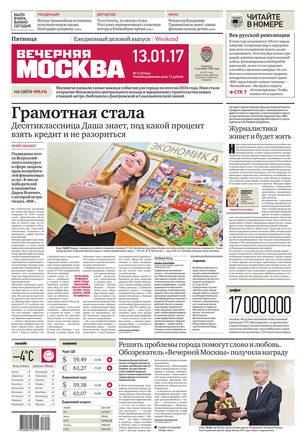 «Вечерняя Москва» — ежедневная российская вечерняя газета, старейшее из вечерних изданий в России, учрежденное в 1923 году. Выходит пять дней в неделю, кроме субботы и воскресенья. Отличается тем, что рассказывает о событиях еще не завершившегося дня. Оперативно освещает хронику и особенности жизни Москвы, охватывает все слои общества и большинство профессиональных и возрастных групп читателей.Издание представлено тремя выпусками – утренним ежедневным, вечерним (выходит три раза в неделю), еженедельным (выходит по четвергам).