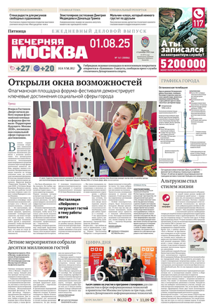 «Вечерняя Москва» — ежедневная российская вечерняя газета, старейшее из вечерних изданий в России, учрежденное в 1923 году. Выходит пять дней в неделю, кроме субботы и воскресенья. Отличается тем, что рассказывает о событиях еще не завершившегося дня. Оперативно освещает хронику и особенности жизни Москвы, охватывает все слои общества и большинство профессиональных и возрастных групп читателей.Издание представлено тремя выпусками – утренним ежедневным, вечерним (выходит три раза в неделю), еженедельным (выходит по четвергам).