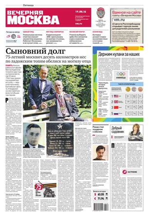 «Вечерняя Москва» — ежедневная российская вечерняя газета, старейшее из вечерних изданий в России, учрежденное в 1923 году. Выходит пять дней в неделю, кроме субботы и воскресенья. Отличается тем, что рассказывает о событиях еще не завершившегося дня. Оперативно освещает хронику и особенности жизни Москвы, охватывает все слои общества и большинство профессиональных и возрастных групп читателей.Издание представлено тремя выпусками – утренним ежедневным, вечерним (выходит три раза в неделю), еженедельным (выходит по четвергам).
