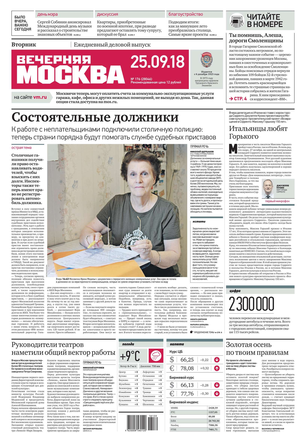 «Вечерняя Москва» — ежедневная российская вечерняя газета, старейшее из вечерних изданий в России, учрежденное в 1923 году. Выходит пять дней в неделю, кроме субботы и воскресенья. Отличается тем, что рассказывает о событиях еще не завершившегося дня. Оперативно освещает хронику и особенности жизни Москвы, охватывает все слои общества и большинство профессиональных и возрастных групп читателей.Издание представлено тремя выпусками – утренним ежедневным, вечерним (выходит три раза в неделю), еженедельным (выходит по четвергам).