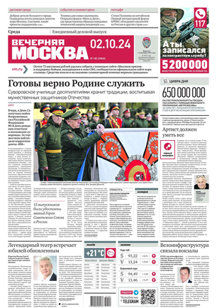 «Вечерняя Москва» — ежедневная российская вечерняя газета, старейшее из вечерних изданий в России, учрежденное в 1923 году. Выходит пять дней в неделю, кроме субботы и воскресенья. Отличается тем, что рассказывает о событиях еще не завершившегося дня. Оперативно освещает хронику и особенности жизни Москвы, охватывает все слои общества и большинство профессиональных и возрастных групп читателей.Издание представлено тремя выпусками – утренним ежедневным, вечерним (выходит три раза в неделю), еженедельным (выходит по четвергам).