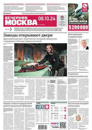 «Вечерняя Москва» — ежедневная российская вечерняя газета, старейшее из вечерних изданий в России, учрежденное в 1923 году. Выходит пять дней в неделю, кроме субботы и воскресенья. Отличается тем, что рассказывает о событиях еще не завершившегося дня. Оперативно освещает хронику и особенности жизни Москвы, охватывает все слои общества и большинство профессиональных и возрастных групп читателей.Издание представлено тремя выпусками – утренним ежедневным, вечерним (выходит три раза в неделю), еженедельным (выходит по четвергам).