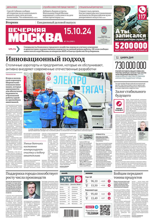 «Вечерняя Москва» — ежедневная российская вечерняя газета, старейшее из вечерних изданий в России, учрежденное в 1923 году. Выходит пять дней в неделю, кроме субботы и воскресенья. Отличается тем, что рассказывает о событиях еще не завершившегося дня. Оперативно освещает хронику и особенности жизни Москвы, охватывает все слои общества и большинство профессиональных и возрастных групп читателей.Издание представлено тремя выпусками – утренним ежедневным, вечерним (выходит три раза в неделю), еженедельным (выходит по четвергам).