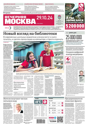 «Вечерняя Москва» — ежедневная российская вечерняя газета, старейшее из вечерних изданий в России, учрежденное в 1923 году. Выходит пять дней в неделю, кроме субботы и воскресенья. Отличается тем, что рассказывает о событиях еще не завершившегося дня. Оперативно освещает хронику и особенности жизни Москвы, охватывает все слои общества и большинство профессиональных и возрастных групп читателей.Издание представлено тремя выпусками – утренним ежедневным, вечерним (выходит три раза в неделю), еженедельным (выходит по четвергам).