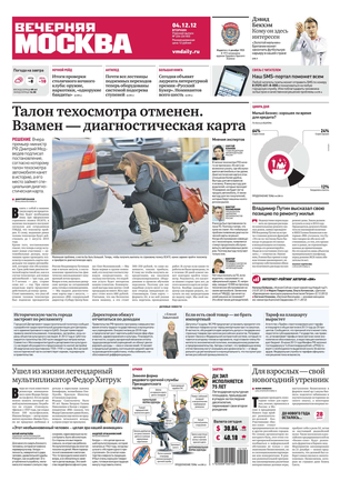 «Вечерняя Москва» — ежедневная российская вечерняя газета, старейшее из вечерних изданий в России, учрежденное в 1923 году. Выходит пять дней в неделю, кроме субботы и воскресенья. Отличается тем, что рассказывает о событиях еще не завершившегося дня. Оперативно освещает хронику и особенности жизни Москвы, охватывает все слои общества и большинство профессиональных и возрастных групп читателей.Издание представлено тремя выпусками – утренним ежедневным, вечерним (выходит три раза в неделю), еженедельным (выходит по четвергам).