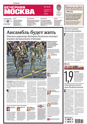 «Вечерняя Москва» — ежедневная российская вечерняя газета, старейшее из вечерних изданий в России, учрежденное в 1923 году. Выходит пять дней в неделю, кроме субботы и воскресенья. Отличается тем, что рассказывает о событиях еще не завершившегося дня. Оперативно освещает хронику и особенности жизни Москвы, охватывает все слои общества и большинство профессиональных и возрастных групп читателей.Издание представлено тремя выпусками – утренним ежедневным, вечерним (выходит три раза в неделю), еженедельным (выходит по четвергам).