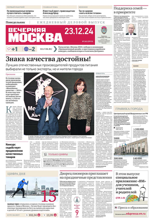 «Вечерняя Москва» — ежедневная российская вечерняя газета, старейшее из вечерних изданий в России, учрежденное в 1923 году. Выходит пять дней в неделю, кроме субботы и воскресенья. Отличается тем, что рассказывает о событиях еще не завершившегося дня. Оперативно освещает хронику и особенности жизни Москвы, охватывает все слои общества и большинство профессиональных и возрастных групп читателей.Издание представлено тремя выпусками – утренним ежедневным, вечерним (выходит три раза в неделю), еженедельным (выходит по четвергам).