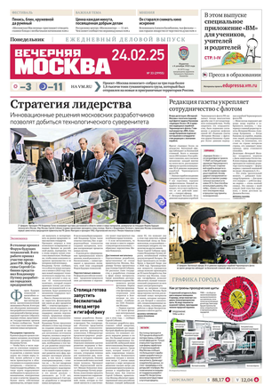 «Вечерняя Москва» — ежедневная российская вечерняя газета, старейшее из вечерних изданий в России, учрежденное в 1923 году. Выходит пять дней в неделю, кроме субботы и воскресенья. Отличается тем, что рассказывает о событиях еще не завершившегося дня. Оперативно освещает хронику и особенности жизни Москвы, охватывает все слои общества и большинство профессиональных и возрастных групп читателей.Издание представлено тремя выпусками – утренним ежедневным, вечерним (выходит три раза в неделю), еженедельным (выходит по четвергам).