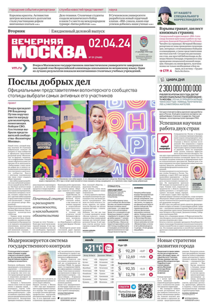 «Вечерняя Москва» — ежедневная российская вечерняя газета, старейшее из вечерних изданий в России, учрежденное в 1923 году. Выходит пять дней в неделю, кроме субботы и воскресенья. Отличается тем, что рассказывает о событиях еще не завершившегося дня. Оперативно освещает хронику и особенности жизни Москвы, охватывает все слои общества и большинство профессиональных и возрастных групп читателей.Издание представлено тремя выпусками – утренним ежедневным, вечерним (выходит три раза в неделю), еженедельным (выходит по четвергам).