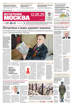 «Вечерняя Москва» — ежедневная российская вечерняя газета, старейшее из вечерних изданий в России, учрежденное в 1923 году. Выходит пять дней в неделю, кроме субботы и воскресенья. Отличается тем, что рассказывает о событиях еще не завершившегося дня. Оперативно освещает хронику и особенности жизни Москвы, охватывает все слои общества и большинство профессиональных и возрастных групп читателей.Издание представлено тремя выпусками – утренним ежедневным, вечерним (выходит три раза в неделю), еженедельным (выходит по четвергам).