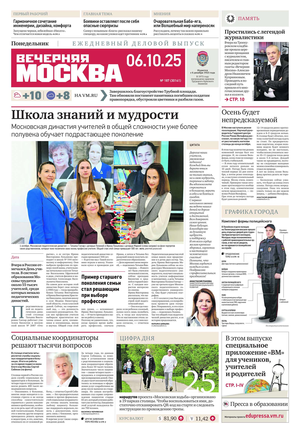 «Вечерняя Москва» — ежедневная российская вечерняя газета, старейшее из вечерних изданий в России, учрежденное в 1923 году. Выходит пять дней в неделю, кроме субботы и воскресенья. Отличается тем, что рассказывает о событиях еще не завершившегося дня. Оперативно освещает хронику и особенности жизни Москвы, охватывает все слои общества и большинство профессиональных и возрастных групп читателей.Издание представлено тремя выпусками – утренним ежедневным, вечерним (выходит три раза в неделю), еженедельным (выходит по четвергам).