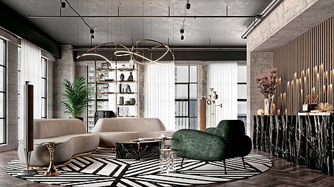 Вау–эффект этому интерьеру придаёт сочетание, казалось бы, несочетаемого: бетонных стен и глянцевого лоска, характерного для гламурных интерьеров. Владелец — приверженец фэн–шуй, но эта эстетика считывается только в дизайне спальни. Весь же остальной интерьер полон бескомпромиссной роскоши. Оформлением интерьера занимались дизайнеры Boca do Lobo Studio, проектного подразделения одноимённой мебельной фабрики из Португалии. Бренд славится необычными, зрелищными вещами, и многие здесь можно увидеть.