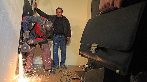 Первый по списку приставов Валентин Михайлов квартиру открыл добровольно. В другую дверь звонить было бесполезно. Приставам пришлось достать "болгарку" и вскрывать дверь квартиры, которую занимал бывший депутат Валерий Никифоров.